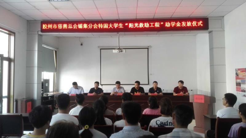 2018年8月21日上午,膠州市慈善總會(huì)鋪集分會(huì)舉行了對(duì)特困大學(xué)生“陽(yáng)光救助工程”助學(xué)金發(fā)放儀式。社會(huì)事務(wù)辦工作人員主持會(huì)議,黨委委員、慈善分會(huì)理事楊書(shū)山同志做了重要講話。會(huì)上有慈善總會(huì)工作人員和慈善捐款的企業(yè)現(xiàn)場(chǎng)發(fā)放助學(xué)金。受助大學(xué)生共15人,受助金額共75000元。